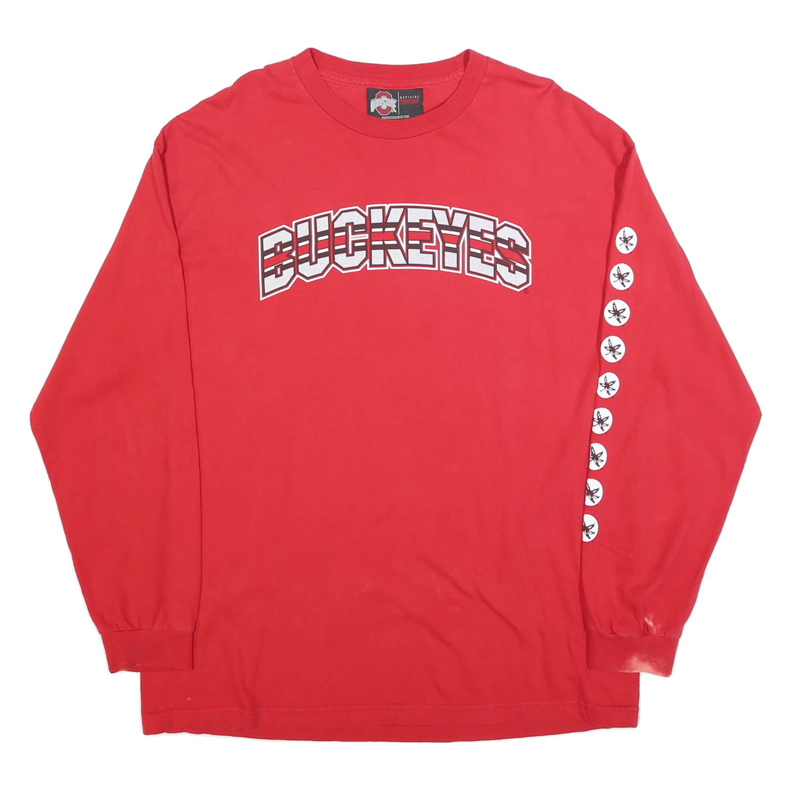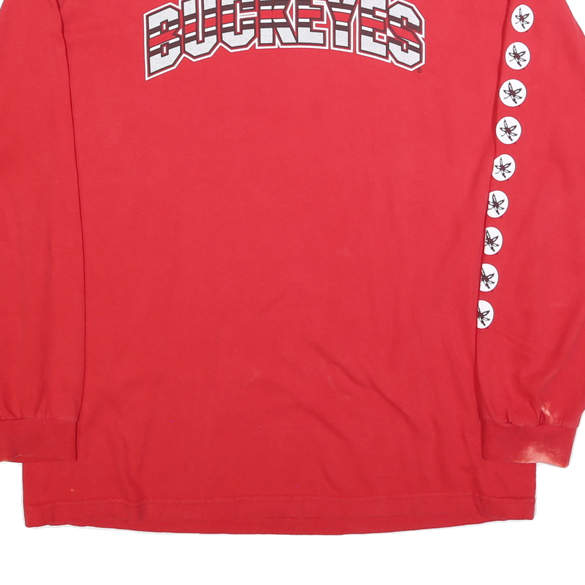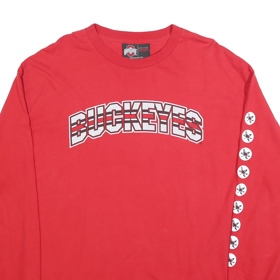 This Ohio State Buckeyes long sleeve T-shirt features a vibrant red colour with bold white and grey outlined 'BUCKEYES' text prominently displayed across the chest. The left sleeve is decorated with a vertical row of white circles each containing a small black buckeye leaf symbol, adding a sporty and collegiate flair.