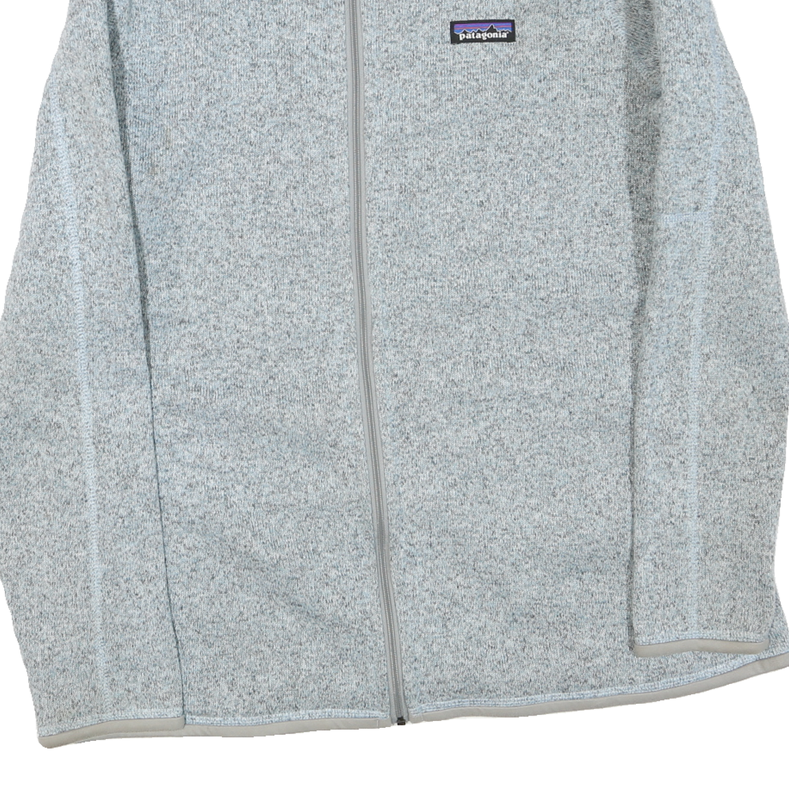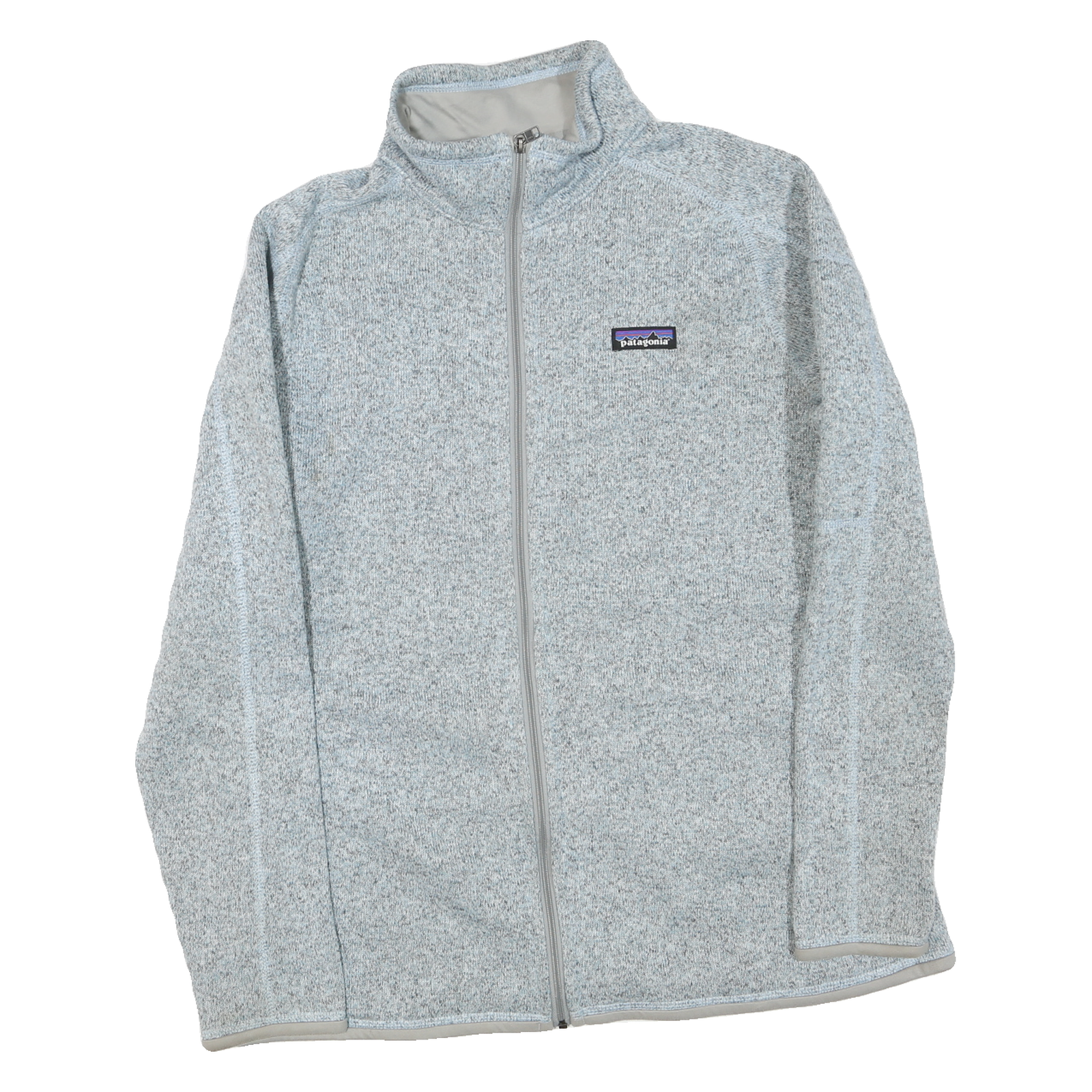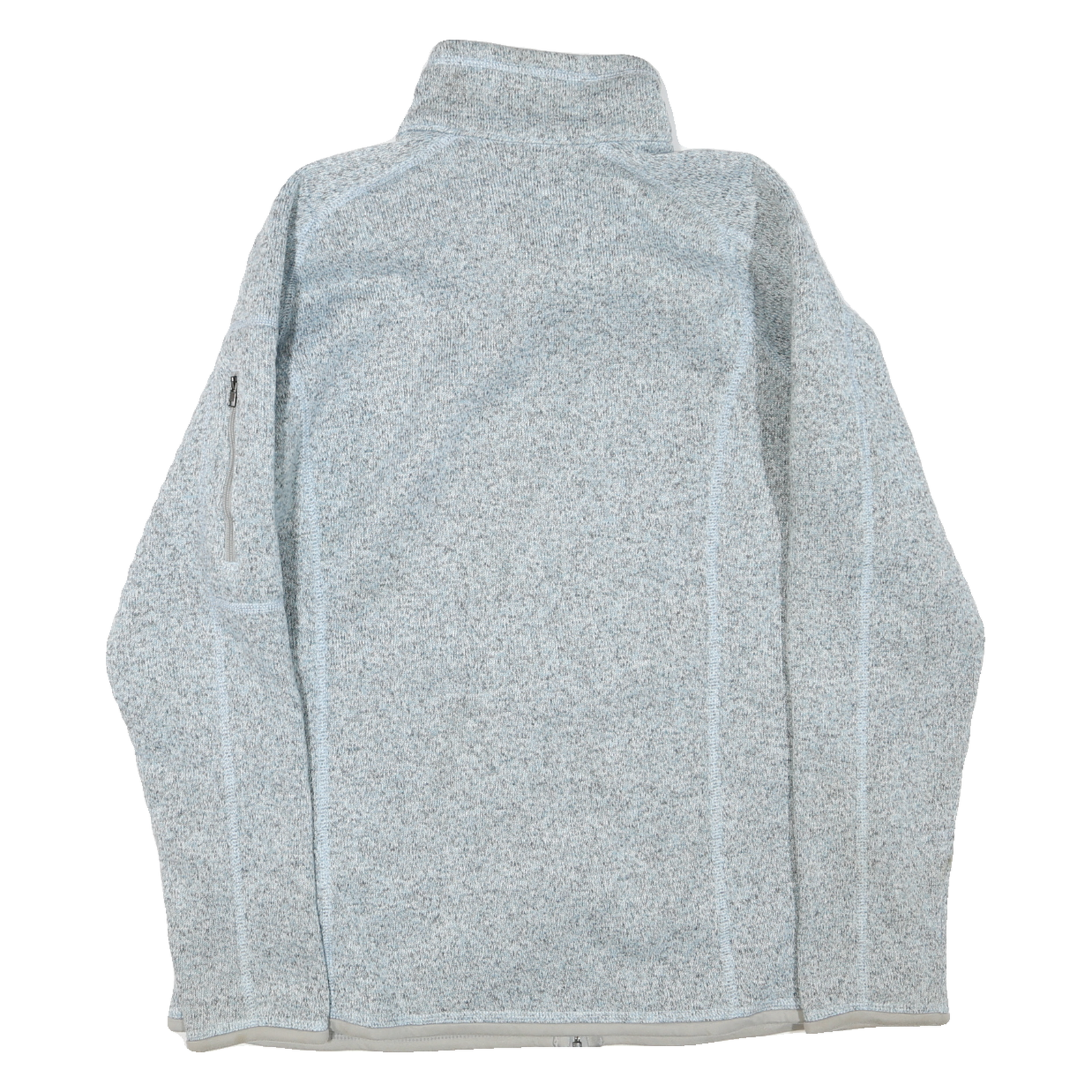 This Patagonia womens jacket showcases a soft grey and light grey knit fabric with a full front zip closure, high collar, and subtle brand logo patch on the chest. It features long sleeves and a zippered pocket on the sleeve for practical storage.