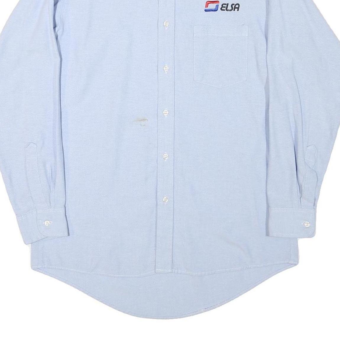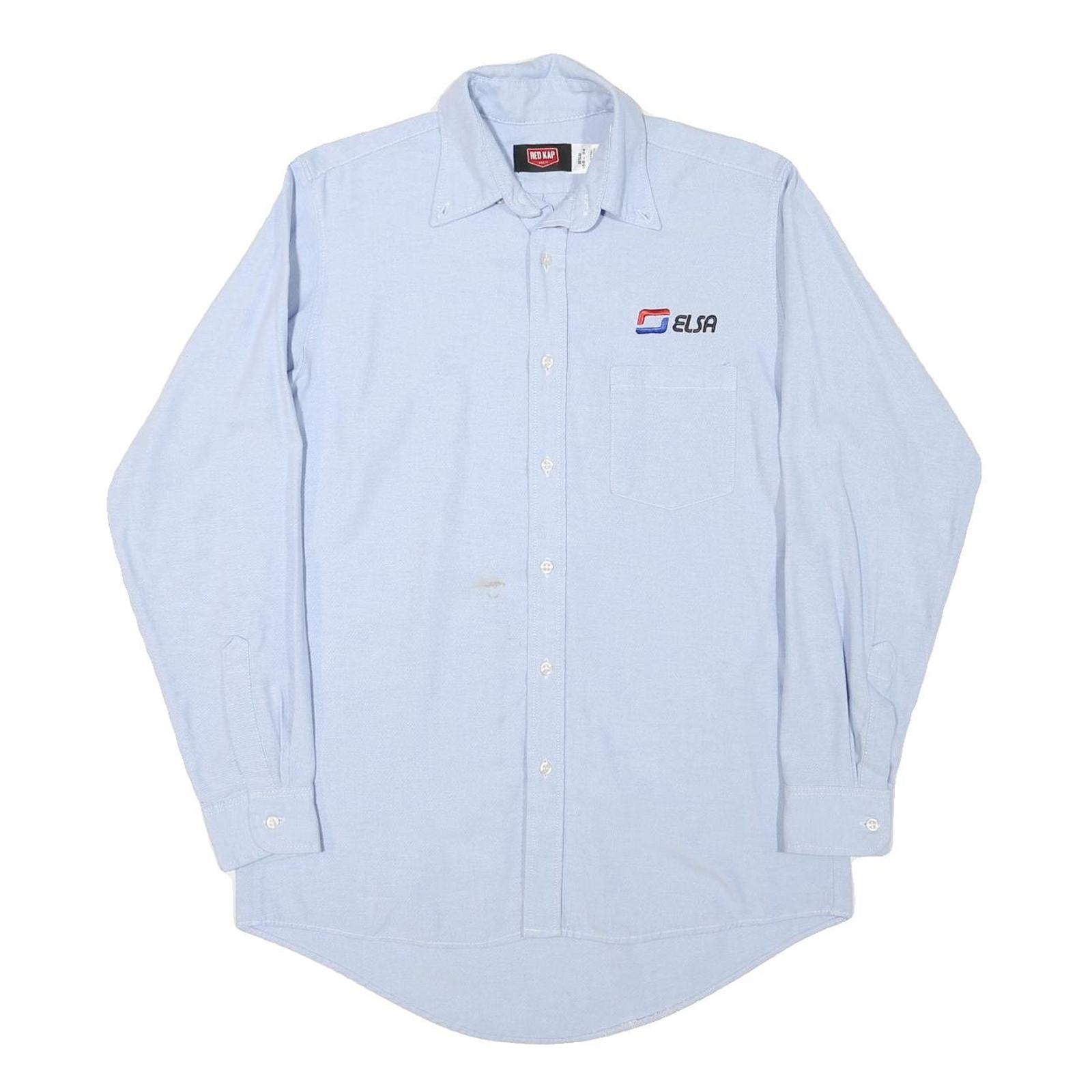This RED KAP mens shirt is a light blue work shirt made from a comfortable cotton blend fabric. It features a classic button-down collar and a full button front. On the chest, there is a single pocket alongside the distinctive ELSA logo embroidered in red, blue, and black thread.