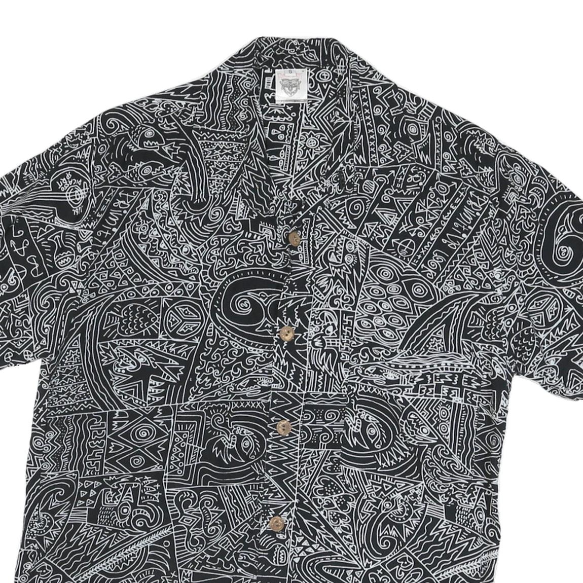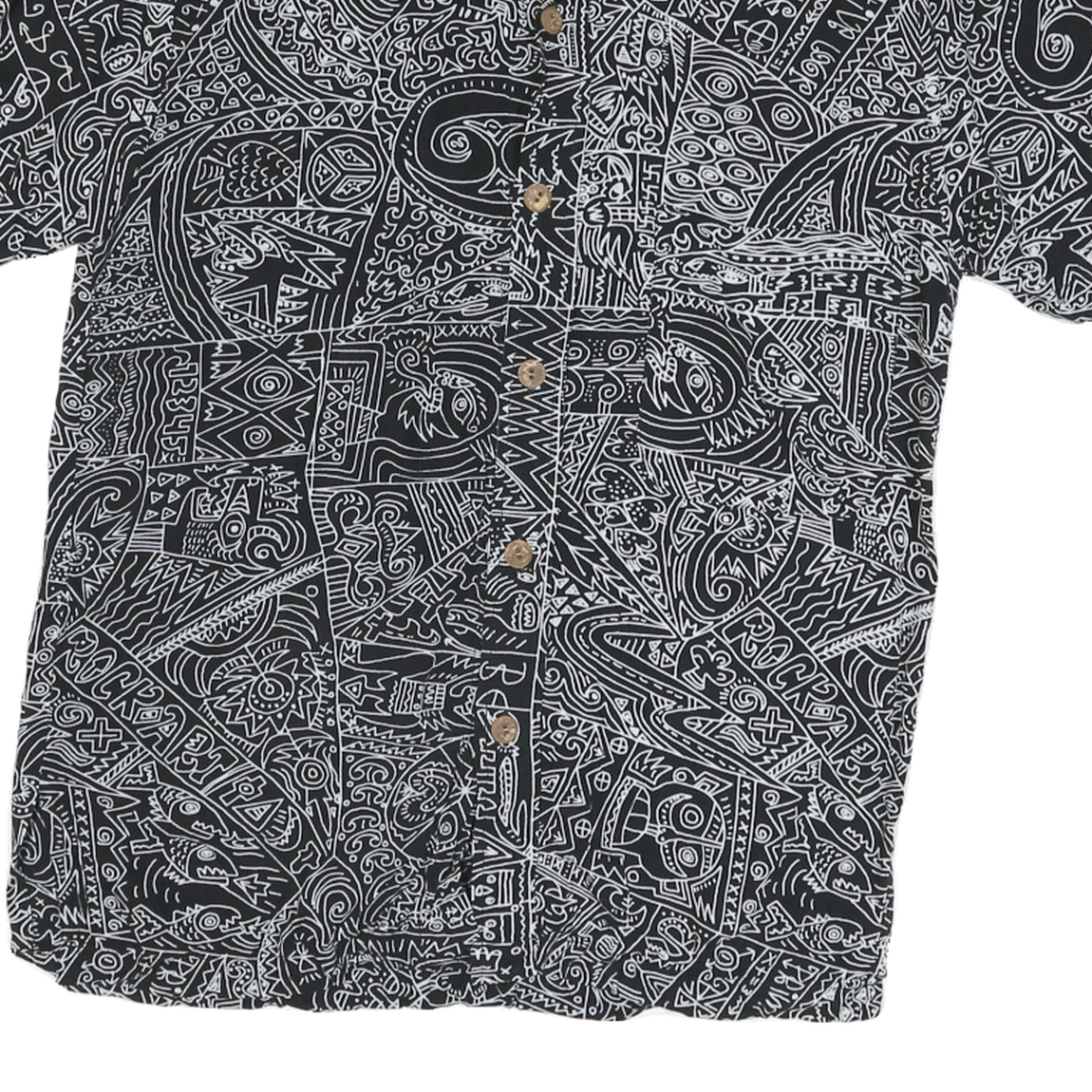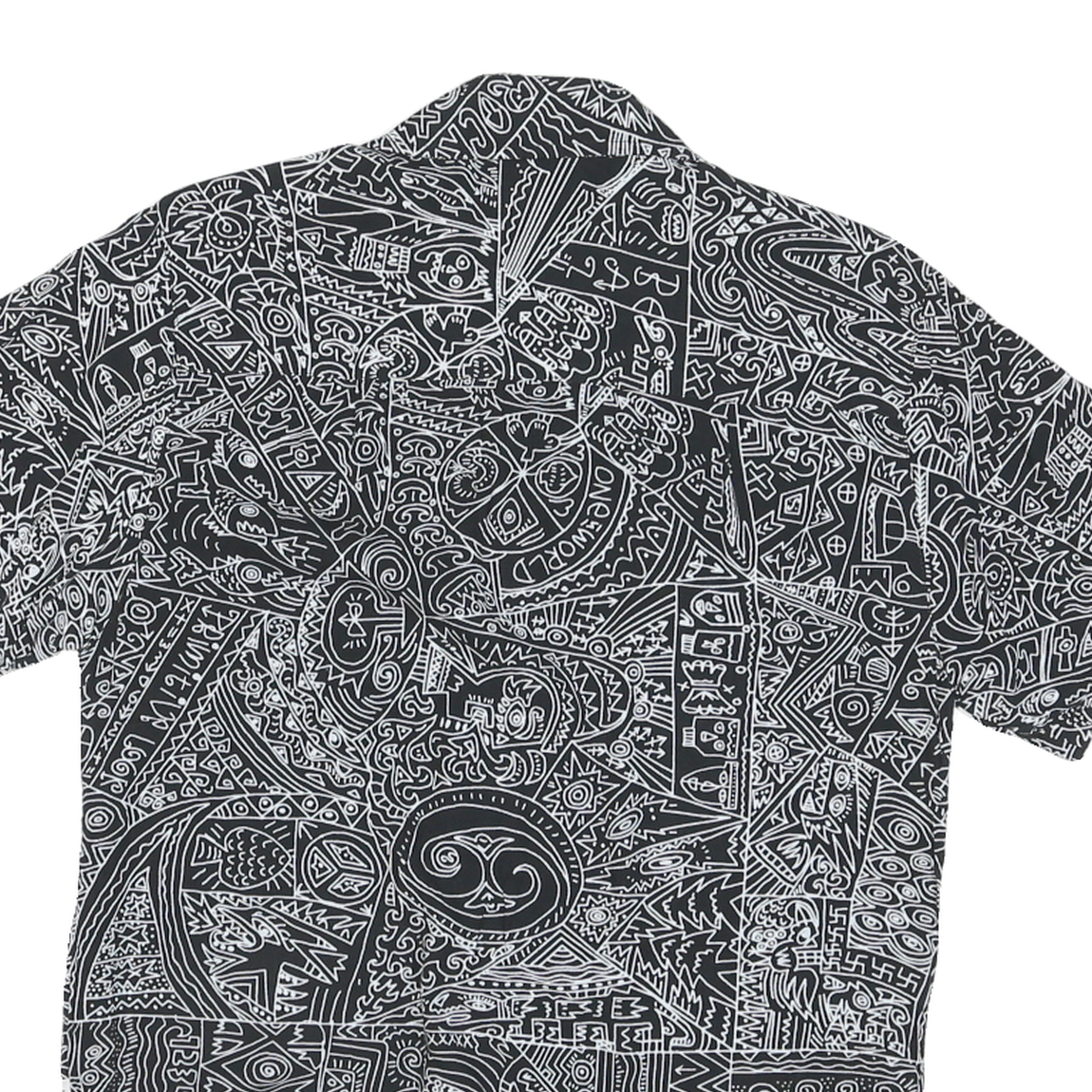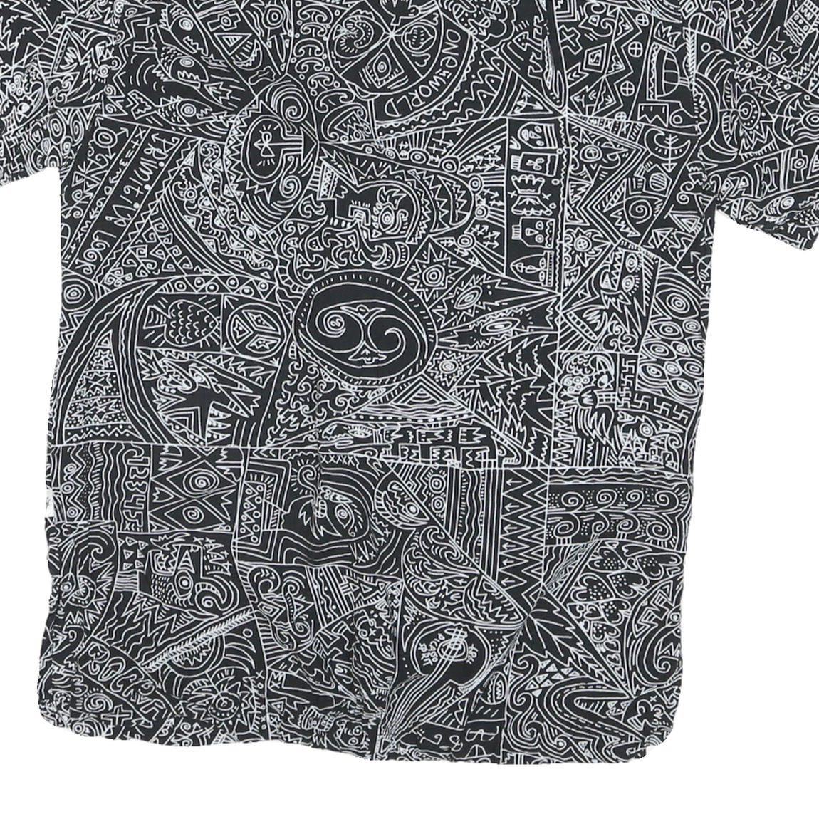 This mens Rock Art shirt features an all-over black and white abstract pattern comprised of various distinctive and imaginative doodle-style designs. The short-sleeve shirt showcases the brand name subtly integrated into the print while maintaining a unique artistic appeal. It buttons down the front with natural-hued buttons completing the look.