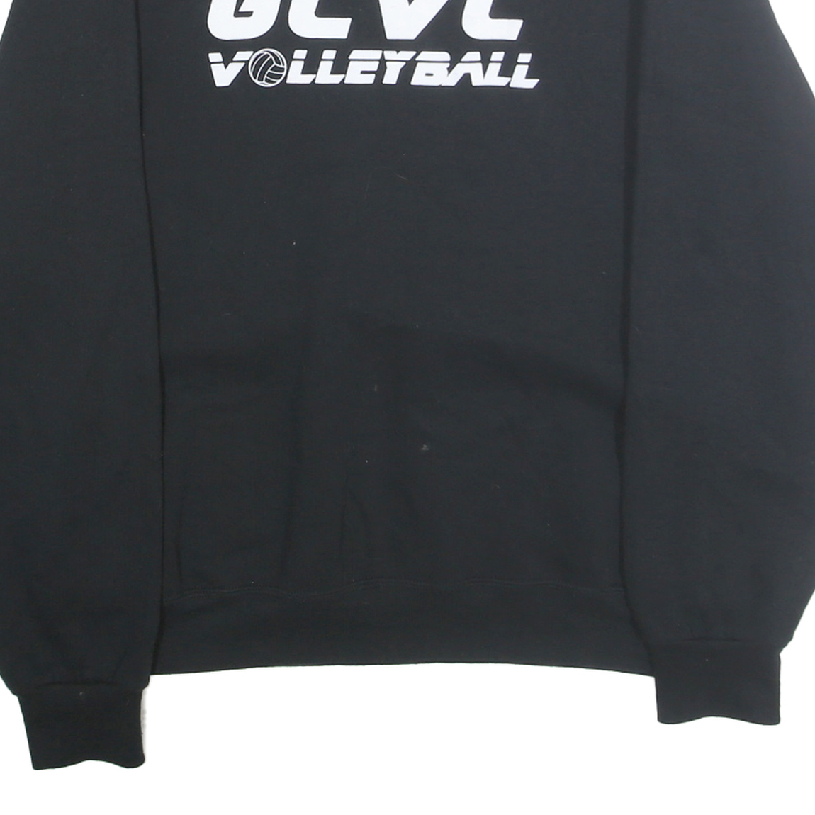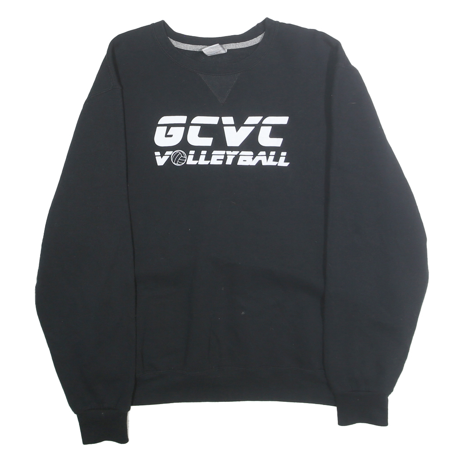 This Russell Athletic men's sweatshirt features a classic black colour and a bold white 'GCVC VOLLEYBALL' graphic printed across the chest with a volleyball icon, lending it a sporty vibe. The crew neck design offers traditional styling suitable for casual wear. Made from a comfortable cotton blend fabric, it provides a soft feel with good durability.