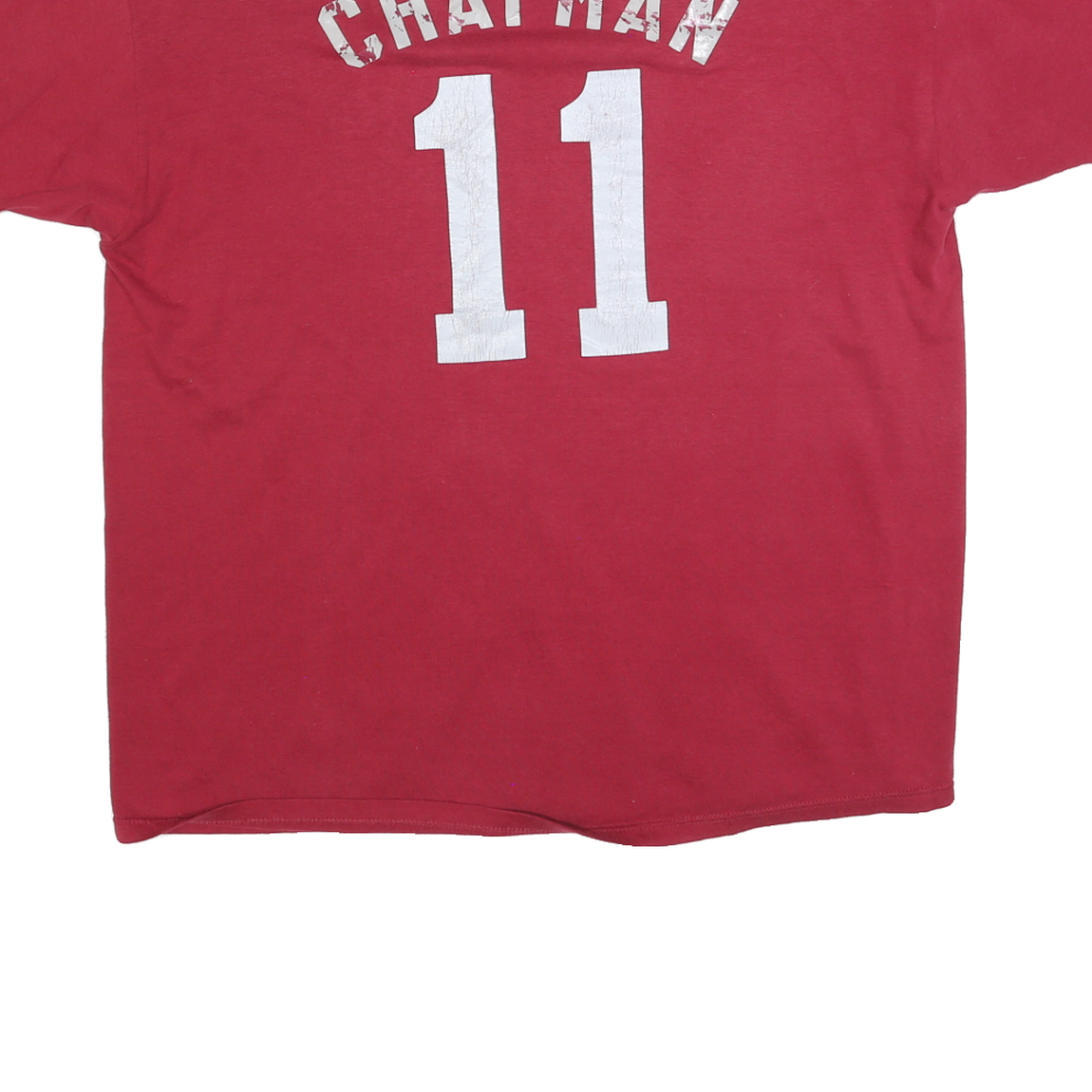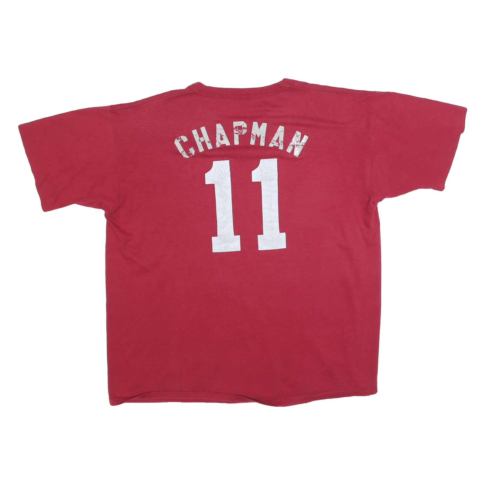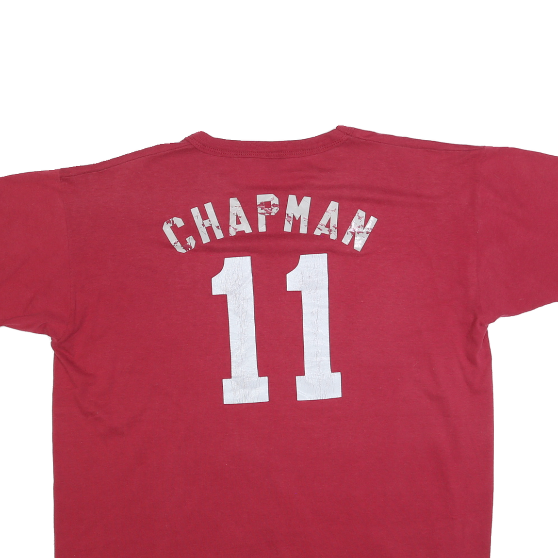 This Russell Athletic mens T-shirt is solid red with a small white stylised logo on the left chest. The back features a large white print of the name "CHAPMAN" above the number "11", both showing vintage wear and cracking, emphasising a stylish retro look.
