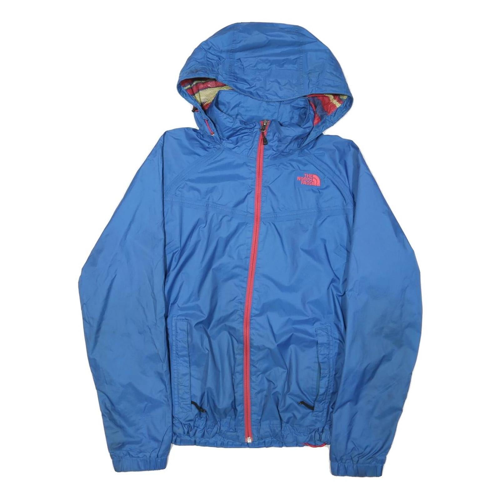 This womens jacket by The North Face features a vibrant blue nylon exterior with signature branding in pink on the chest and sleeve. It has a full-length pink zip closure complemented by two front zip pockets and an adjustable hood lined with a colourful mesh pattern. The jacket has an elasticated hem and cuffs for a secure, comfortable fit.