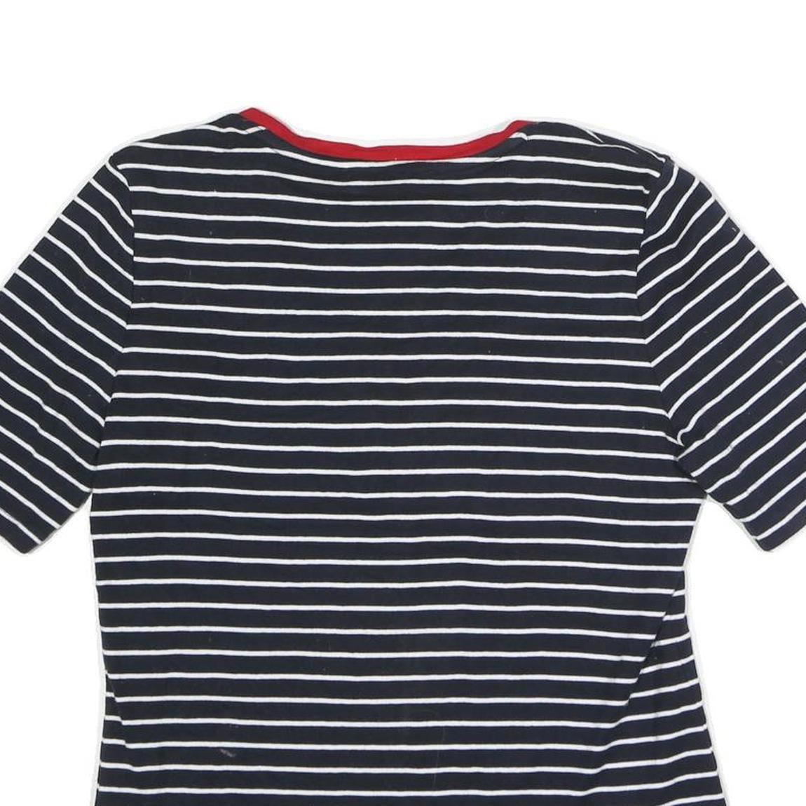 This Tommy Hilfiger womens top features a classic navy blue base with white horizontal stripes throughout, complemented by a striking red trim along the V-neckline. It showcases a small Tommy Hilfiger logo tag on the sleeve for subtle branding. The cotton blend fabric offers a soft, comfortable feel with slight stretch for ease of movement.