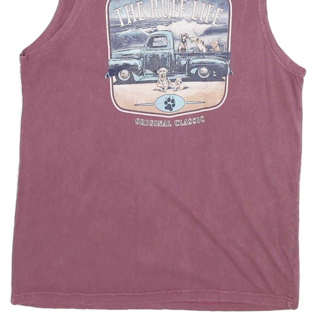 This US VINTAGE mens vest is crafted from a comfortable cotton blend with a soft, worn-in feel. It features a muted purple base colour with a vintage-inspired graphic on the front depicting a blue truck and several dogs, alongside the text "Livin' The Ruff Life" and "Original Classic." The vest has a sleeveless design and a classic crew neckline, offering a relaxed fit ideal for casual summer wear.