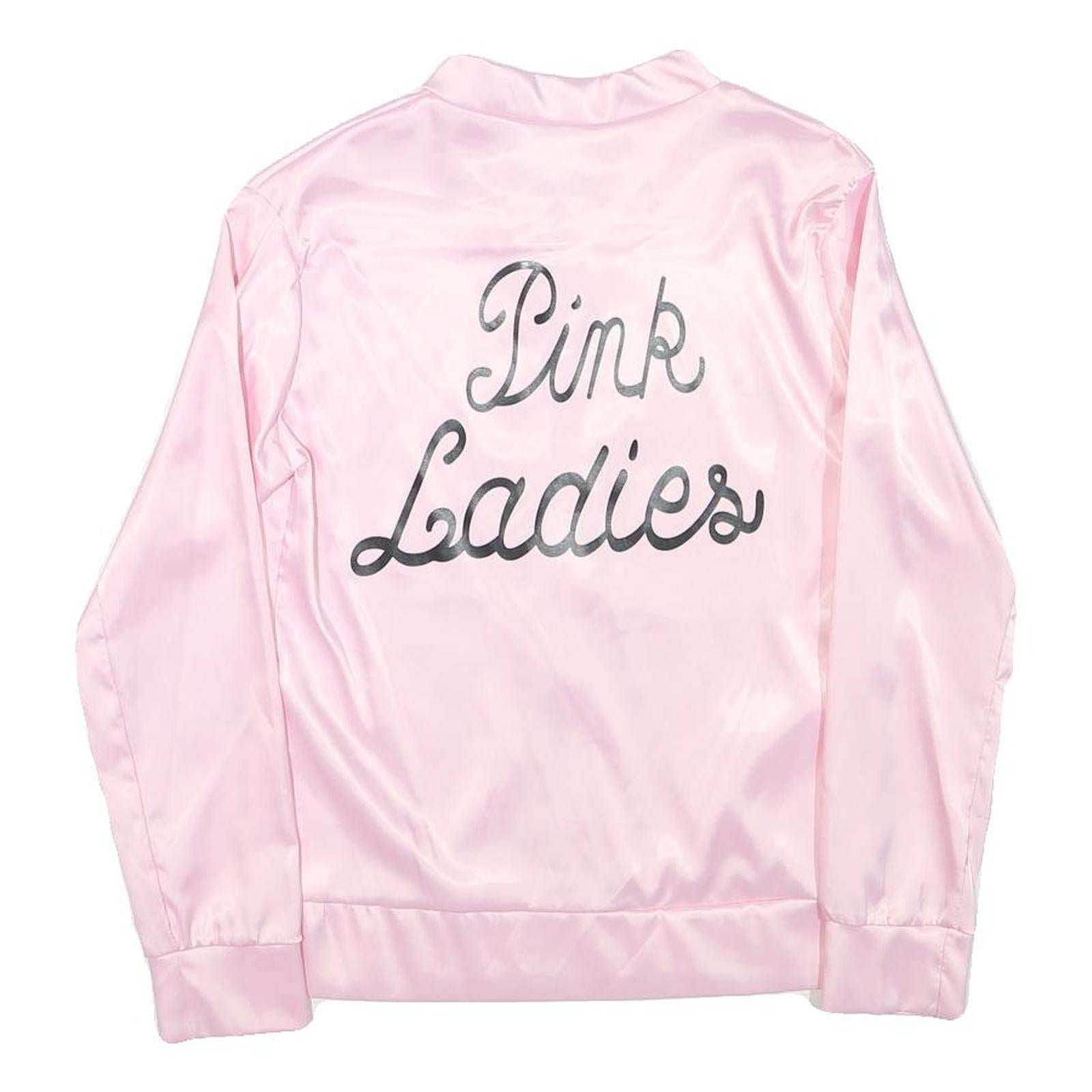 This womens jacket features a soft pastel pink colour crafted from a smooth polyester blend fabric with a satin-like finish. The front bears a subtle embroidered "Pink Ladies" on the chest, mirrored by a larger scripted text across the back, adding a distinctive retro vibe. The jacket fastens with a central zip and includes ribbed cuffs and hem for a secure yet comfortable fit.