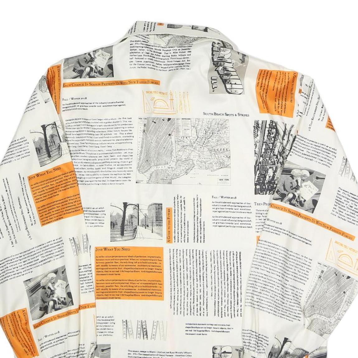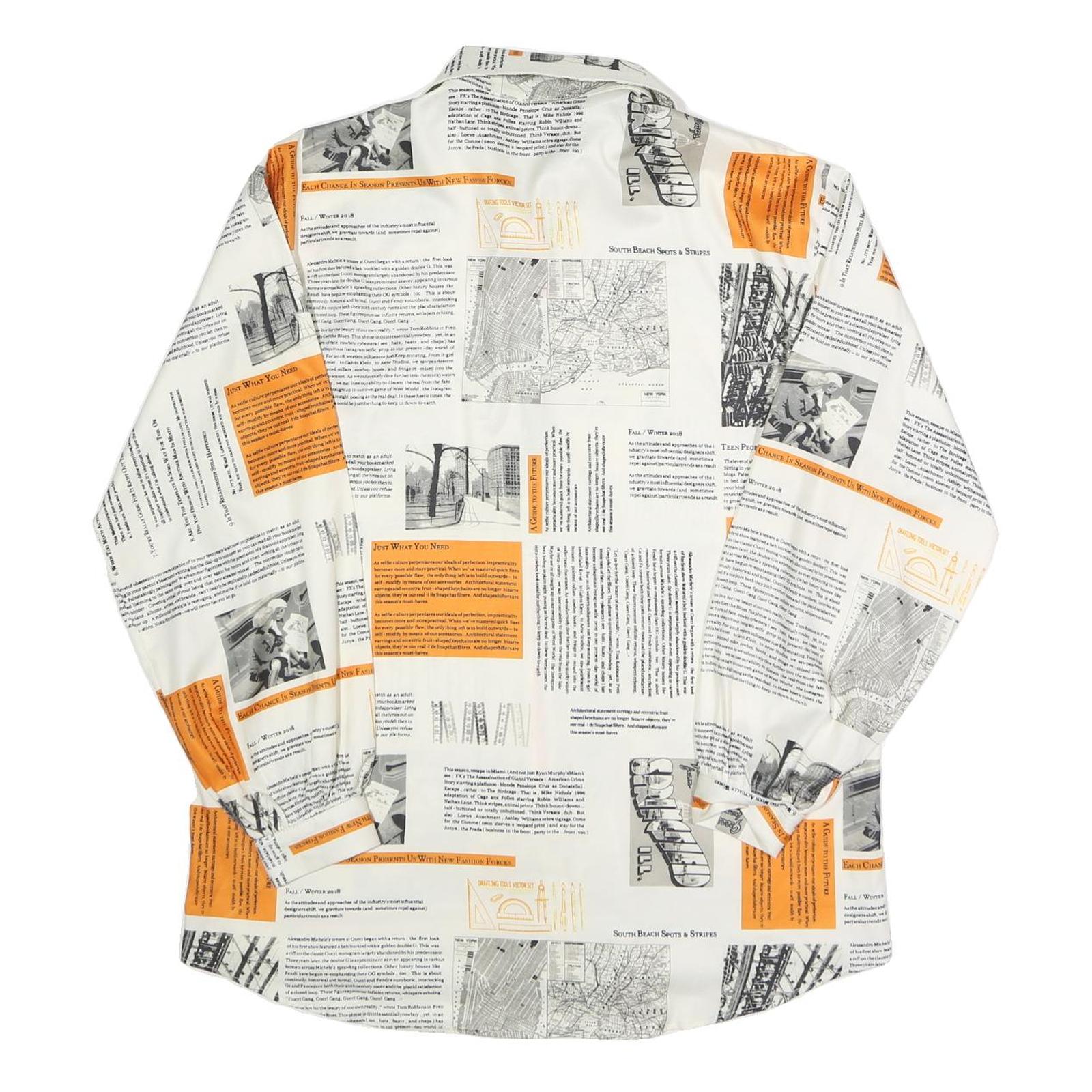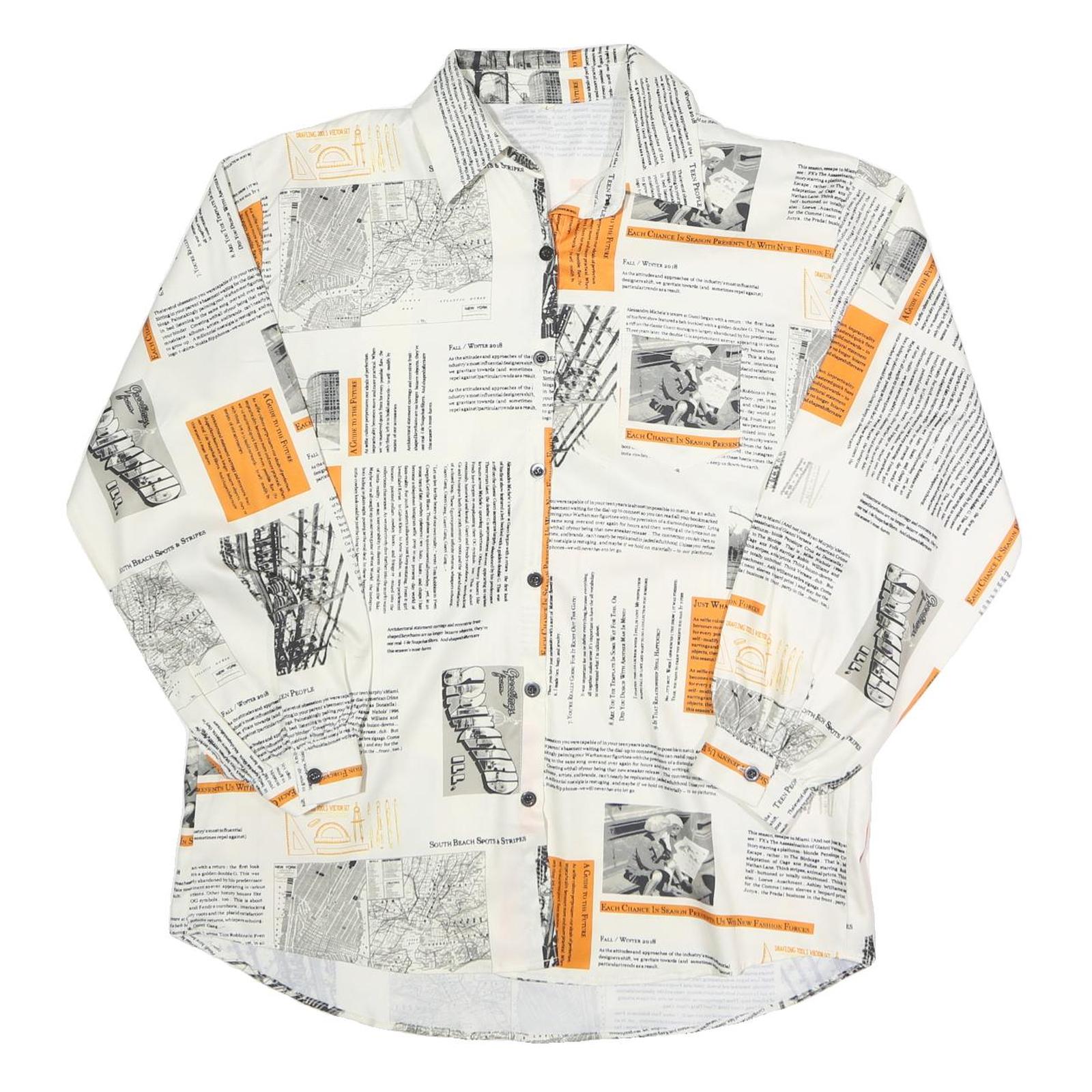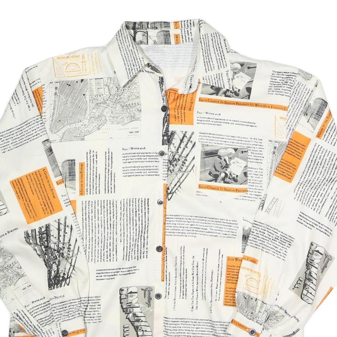 This womens shirt features a striking white base adorned with printed black newspaper-style text and photographic details, accented by bold orange highlights throughout. The overall design gives a modern, artsy vibe with a unique editorial flair.
